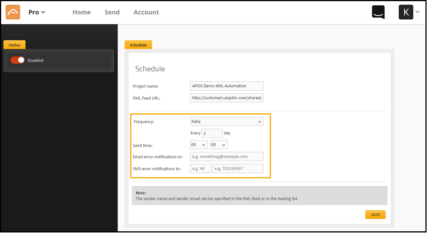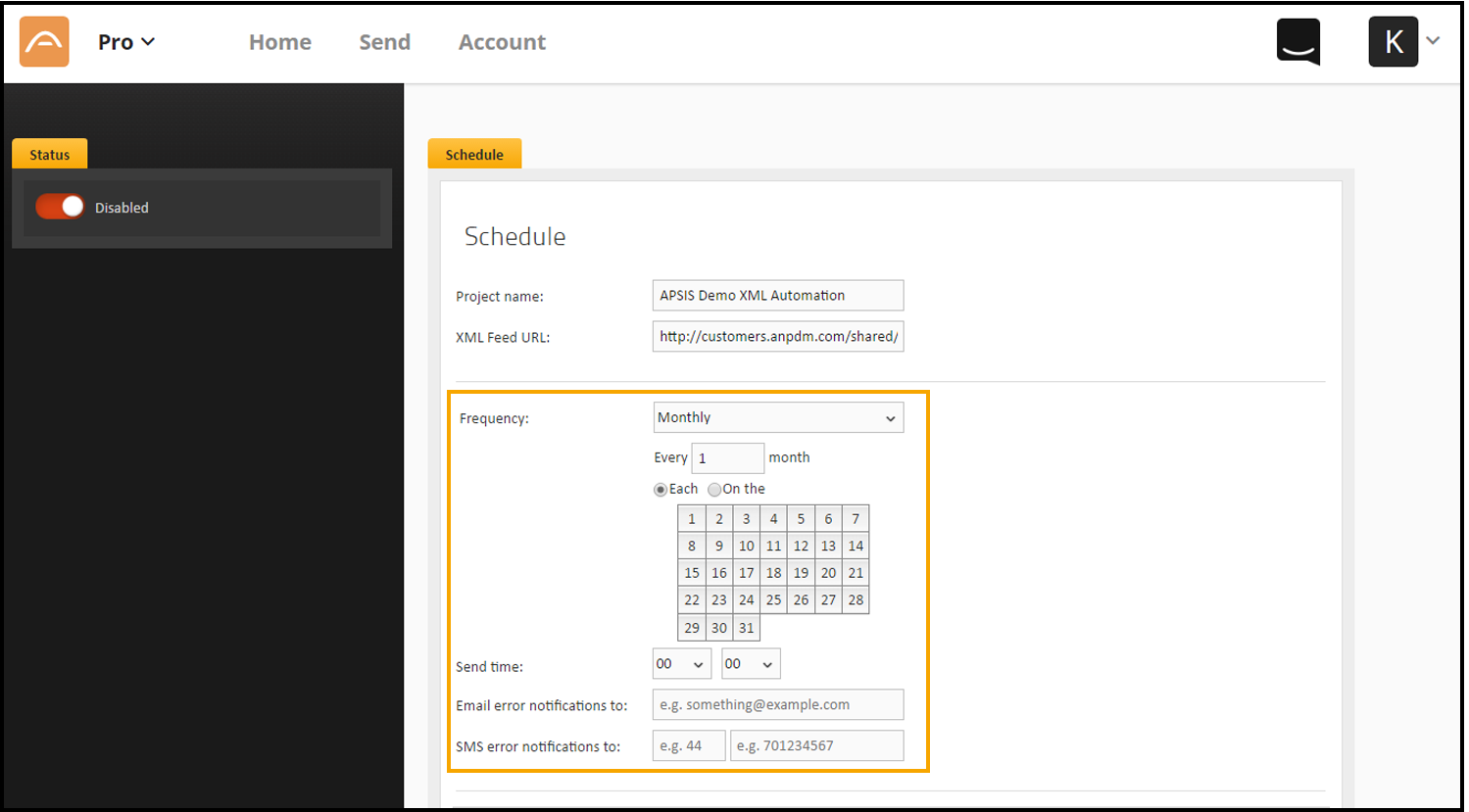 4. Select the frequency for your XML automation (how often the information from the XML feed should be fetched into a newsletter and sent to the selected mailing list stated in the XML feed):